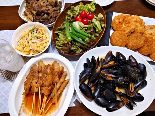9月はほぼ出掛けていないから食事の写真ばっかりだけど。 久々の飲み屋メニュー!! ムール貝のバター蒸し、焼き鳥、メンチカツ&ビーフシチューコロッケ、サラダ、チャプチェ風、マカロニサラダ。しめのムール貝のリゾット。 (白飯&調味料&チャプチェ風&…