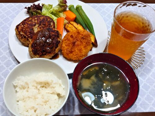 ハンバーグ、カニクリームコロッケ、大根とわかめのお味噌汁。 (白飯&調味料&オクラ除く4人分合計950円) 安定のハンバーグ。 絶対的夕食の王、ハンバーグは絶対に文句でないよねー!! ハンバーグも良いけれど、子供たちはしっかり周りの野菜もパクパクよく…