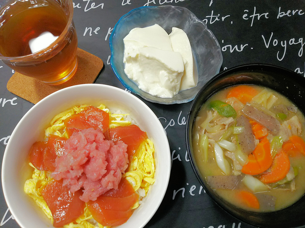 マグロ丼、おぼろ豆腐、豚汁。
